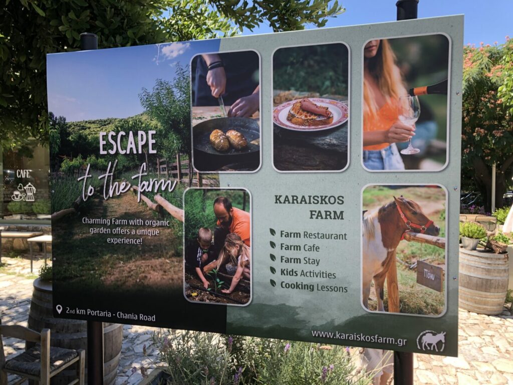 Na farmě je všechno přizpůsobeno pro turistiku, která je také hlavním zdrojem příjmů. Zelenina a ovoce jsou v biokvalitě a návštěvníci mohou ochutnat přímo ze stromu nebo keře či záhonu. Živočišnou výrobu zastupuje chov ovcí, prasat, poníků a oslů. Ve vesnici má farma svojí restauraci, kavárnu a minimarket. Na farmě pracují členové jedné rodiny, kteří do jejího vybudování a provozu vložili veškeré úspory. Největší finanční přínos mají v současné době kurzy vaření, jež jsou celou sezónu vyprodané. Úspěšné jsou také sobotní trhy s prodejem výrobků a ukázkami zpracování. Farma dále nabízí jízdy na ponících, ochutnávky vína, svatby, prodej specialit a suvenýrů. Plány do budoucna se týkají hlavně rozšíření ubytování. Velmi doporučujeme návštěvu těm, kteří podobné podnikání už provozují nebo by s ním chtěli začít. Seznámit se podrobněji s farmou lze na internetových stránkách www.karaiskosfarm.gr.