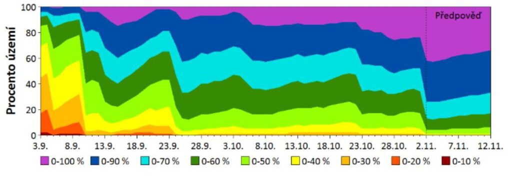 Úvodní graf: Relativní půdní vlhkost na území Česka (procento území) za poslední dva měsíce s desetidenní předpovědí Zdroj CzechGloge