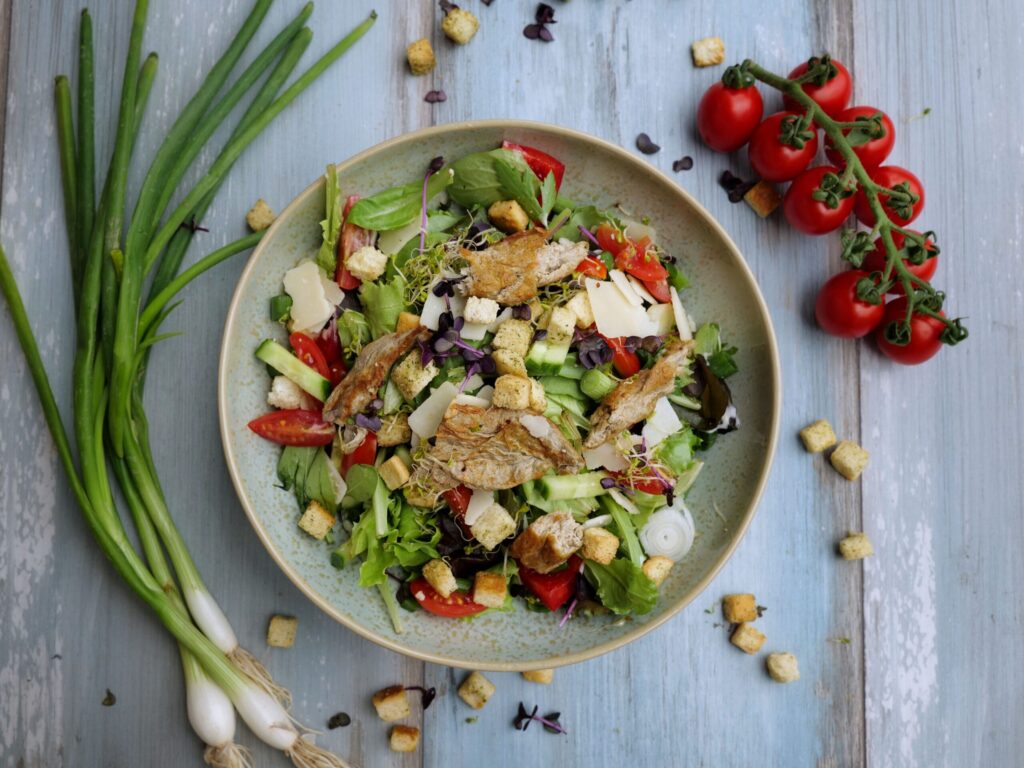 DLG, foto DLG (Plísňové mycelium lze zpracovat na výrobky podobné masu bohaté na bílkoviny – zde zobrazené v čerstvém salátu se sezónní zeleninou)