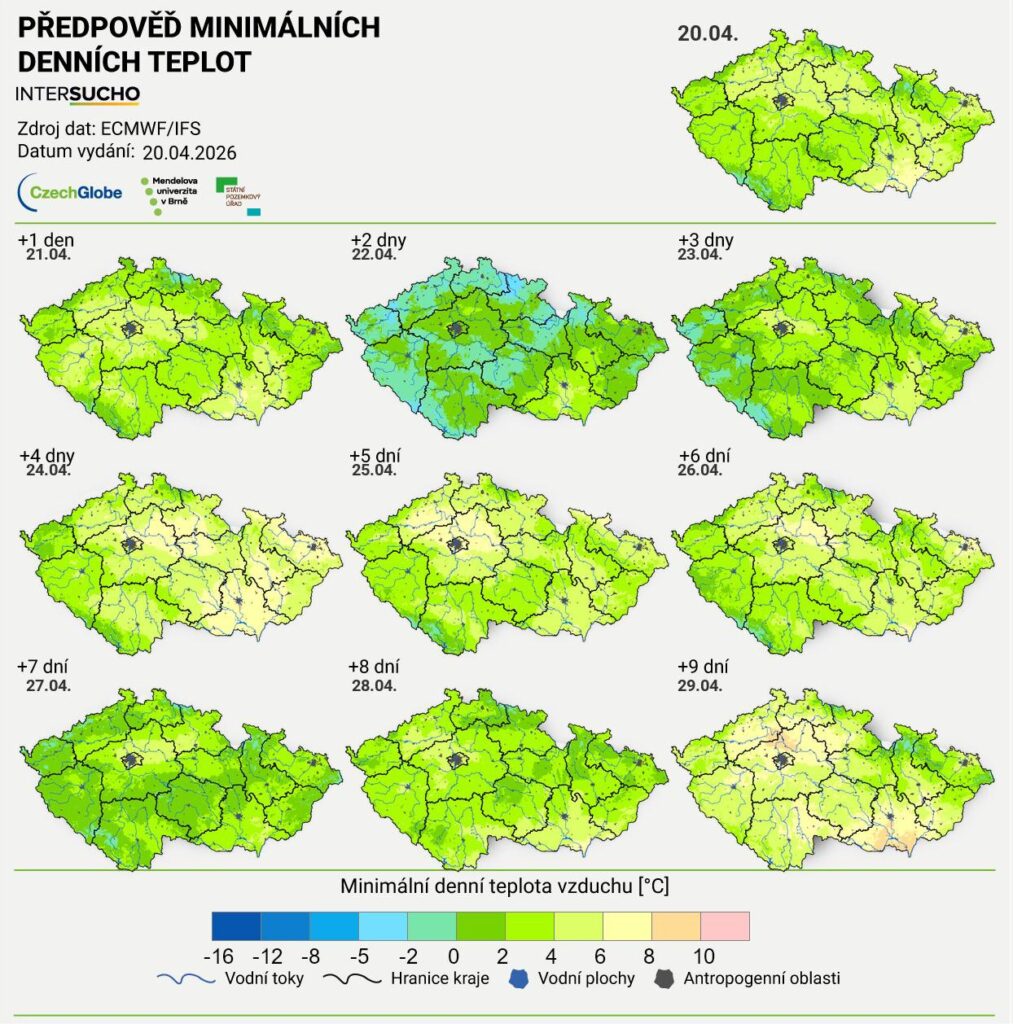 Úvodní obrázek: Minimální denní teploty vzduchu pro období 20. 4.– 29. 4. Zdroj bulletin CzechGlobe
