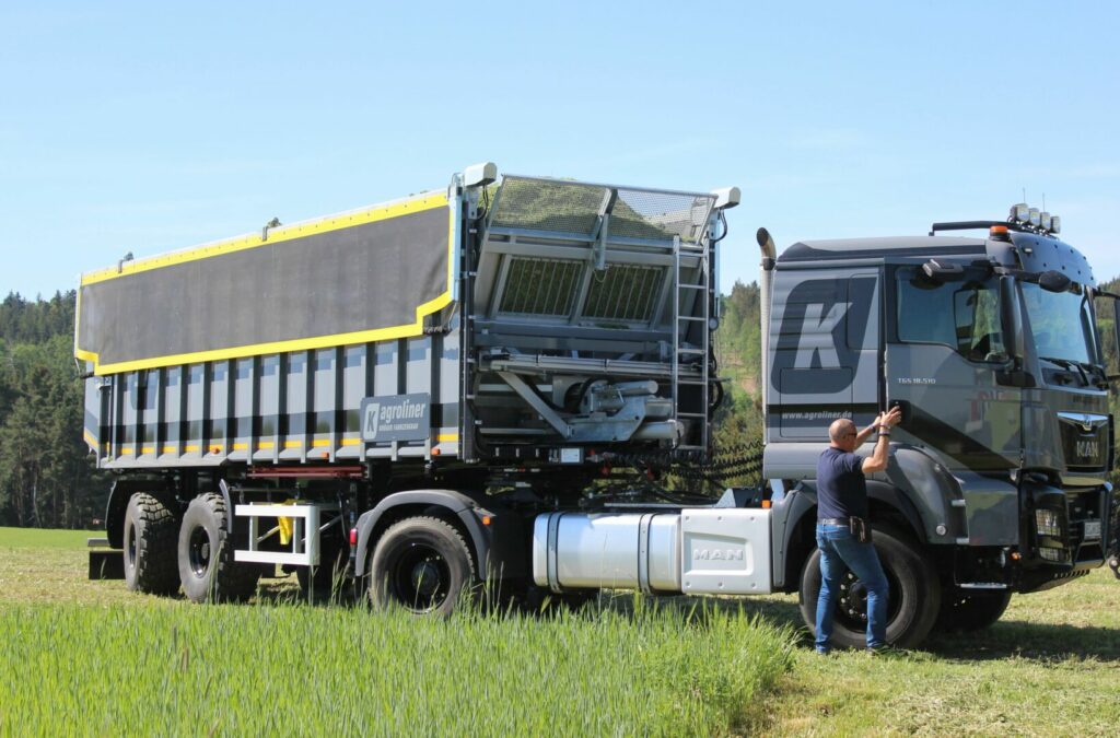 Návěs s výtlačným štítem Agroliner SAW32 je novinkou na českých komunikacích a polích. Doplňuje již tak širokou nabídku zemědělských traktorových návěsů s výtlačným čelem, které firma Kröger nabízí pod označením TAW. Tyto návěsy již naši zemědělci znají a v řadě případů již také úspěšně využívají. V rámci tour byly na našem území naplánované dvě zastávky, my jsme zastihli soupravu na Havlíčkobrodsku, v zemědělském podniku Agro Záblatí, a. s., kde návěs odvážel řezanku od samojízdné řezačky do nové senážní jámy s kapacitou 2500 t. Možnosti jeho nasazení jsou však mnohem širší. Návěs využívá výtlačný štít, který tvoří celek s hydraulicky plynule posuvným dnem. Součástí nástavby je také hydraulicky otevíratelné zadní čelo. Díky této konstrukci je návěs ideální nejen pro odvoz senáže či siláže, ale také sypkých materiálů, různých zemědělských plodin, štěpky, statkových hnojiv či separátu z bioplynových stanic.