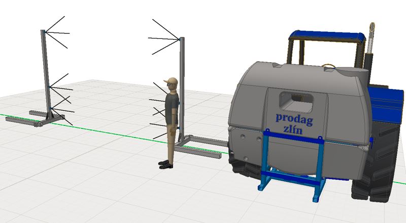 Aplikace dezinfekčního postřiku na vozidla a stroje vjíždějící do areálů chovů je prováděna ze dvou sloupů. Ty jsou vybaveny zástřikovými tryskami dle požadovaných specifikací na pokrytí dezinfekcí. Spodní trysky slouží k nanesení dezinfekce na kola a podvozek stroje. Trysky umístěné ve výšce 100 cm nad zemí jsou nastavitelné a slouží k případné dezinfekci svislých ploch stroje do výšky cca 170 cm. Pro případný vyšší zástřik stroje slouží trysky umístěné ve výšce 240 cm. Všechny trysky mají pomocí regulátoru párové ovládání.*