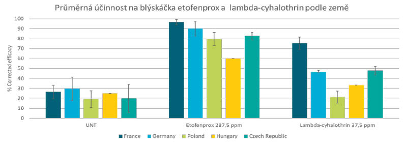 V posledním roce se velmi rozšířila diskuze ohledně vzrůstající rezistence úč. látky ethofenprox. Naše firma přes 20 let monitoruje rezistenci proti blýskáčku v Evropě a nezaznamenala během této doby posun v rezistence a zhoršení situace. Do monitoringu jsme se v roce 2025 zapojili i my jako Česká republika a v naší laboratoři v Londerzeel v Belgii se účinnost Trebonu pohybovala okolo 80 % a účinnost porovnávané látky lambda-cyhalothrin pak byla okolo 50 %, viz graf. Je třeba si uvědomit, že i při této účinnosti a silném náletu brouků vždy v porostu nějaké blýskáčky najdeme. Volbou vhodného přípravku a termínu ošetření však napomáháme udržet tohoto škůdce pod prahem škodlivosti. • *