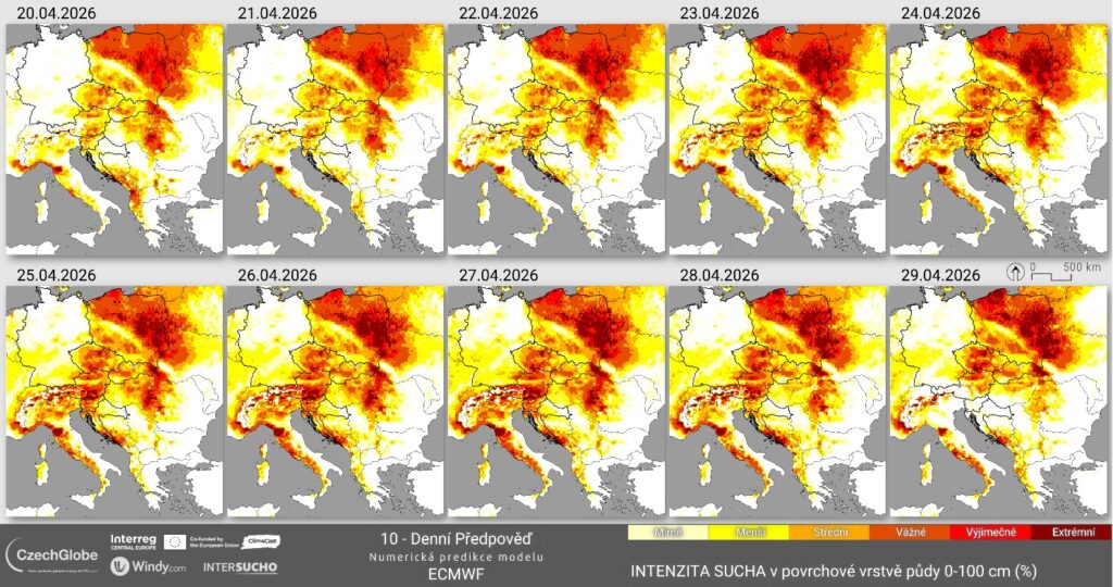 Úvodní obrázek: Předpověď intenzity sucha ve vrstvě půdy 0–100 cm pro období 20. 4. – 29. 4. (Zdroj bulletin CzechGlobe)*