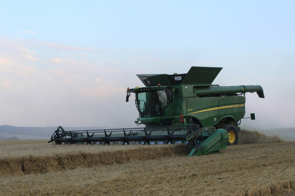 Sklizeň pšenice na rozlehlém, více než třiceti hektarovém poli v nadmořské výšce 400 metrů nad mořem byla zorganizována skutečně ve velkém. V jednoznačné převaze na počet sklizňových strojů byli poskytovatelé služeb s dalšími třemi mlátičkami značek Case IH a Claas. Sklizené zrno bylo třeba odvážet do místa uložení 15 km daleko. Spolu s pěkným výnosem rané odrůdy ozimé pšenice (více než 10 tun z hektaru) to bylo důvodem pro přítomnost velkého počtu odvozních souprav traktorů různých značek s návěsy a jednoho čtyřnápravového nákladního automobilu, vybaveného velkoobjemovým kontejnerem.