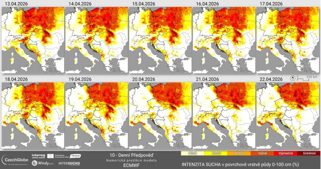Úvodní obrázek: Předpověď intenzity sucha ve vrstvě půdy 0–100 cm pro období 13. 4.–22. 4. Zdroj bulletin CzechGlobe