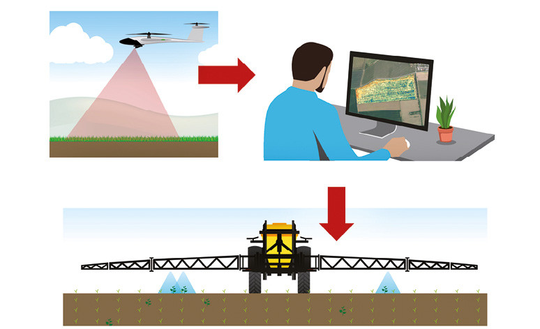 Snímek z dronu, tedy kolmo shora, je daleko přesnější a vidí každý plevel lépe než kamera, která je umístěná na ramenech postřikovače a míří šikmo dopředu. Z aplikační mapy podle skutečné aplikační výměry také není problém zjistit skutečnou budoucí spotřebu chemikálie. U některých pozemků také můžeme dojít k závěru, že určitou část pole vůbec ošetřovat nebudeme, jelikož by poježdění pole způsobilo větší škody. Opačným extrémem může být situace, kdy bude pole tak hustě zaplevelené, že nakonec bude nutné plošné ošetření, nikoli cílené.